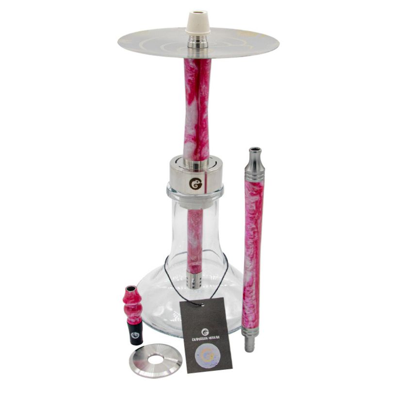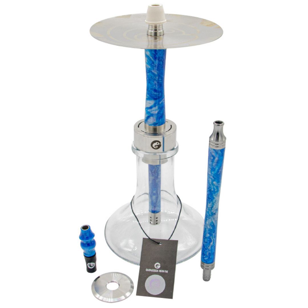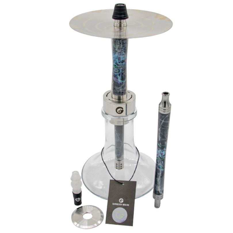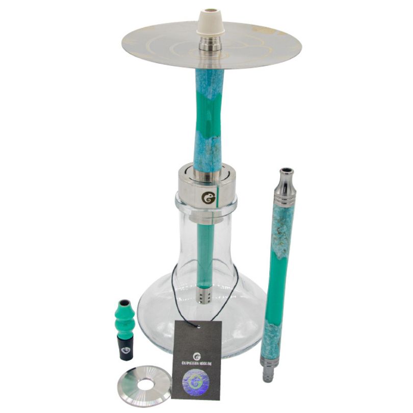 La cachimba está fabricada completamente en acero inoxidable y un recubrimiento del mástil fabricado en RESINA ACRÍLICA . Tanto la cámara, mástil, plato, tubo de inmersión y conexiones de la cachimba están fabricados en este material.