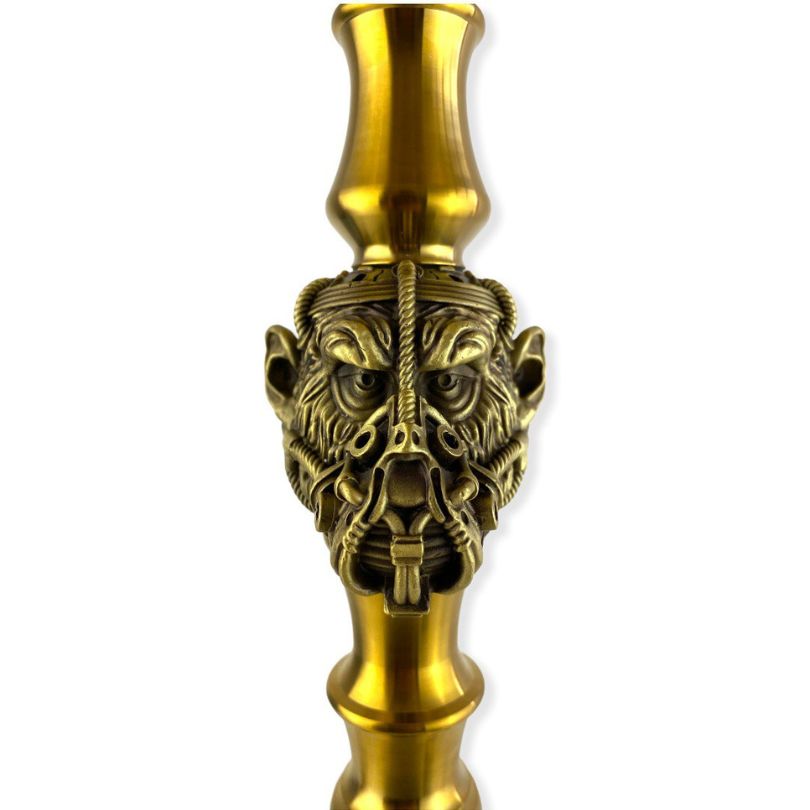 En primer lugar, la cachimba MAKLAUD HELIOS PROJECT 21 GOLD cuenta con un sistema de purga único y un diseño increíble con la figura de un mono representando el mítico mono de MAKLAUD en el centro del mástil esta vez con un casco azul turquesa, consiguiendo que el humo salga por la propia boca y casco al purgar.